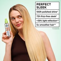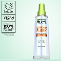 Garnier Fructis Diamond Sleek Shine-Coat Smoothing Spray silottava suihke pörröisille hiuksille. Tekee hiuksista sileät ja kiiltävät ja hallitsee pörröisyyttä. Kevyt koostumus suojaa ja silottaa hiuksiasi ja hallitsee pörröisyyttä jopa kosteassa ilmankosteudessa ilman rasvaista tai tahmaista tunnetta. Saat jopa 100 tuntia kiiltoa¹ ja 72 tuntia sileät hiukset ilman pörröisyyttä¹.