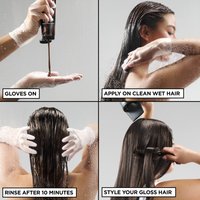 Laita suojakäsineet käteen ja levitä puhtaisiin, kosteisiin hiuksiin,Levitä hiuspohjasta kohti hiusten pituuksia, kunnes koko hiukset on peitetty. Anna vaikuttaa 10 minuuttia.